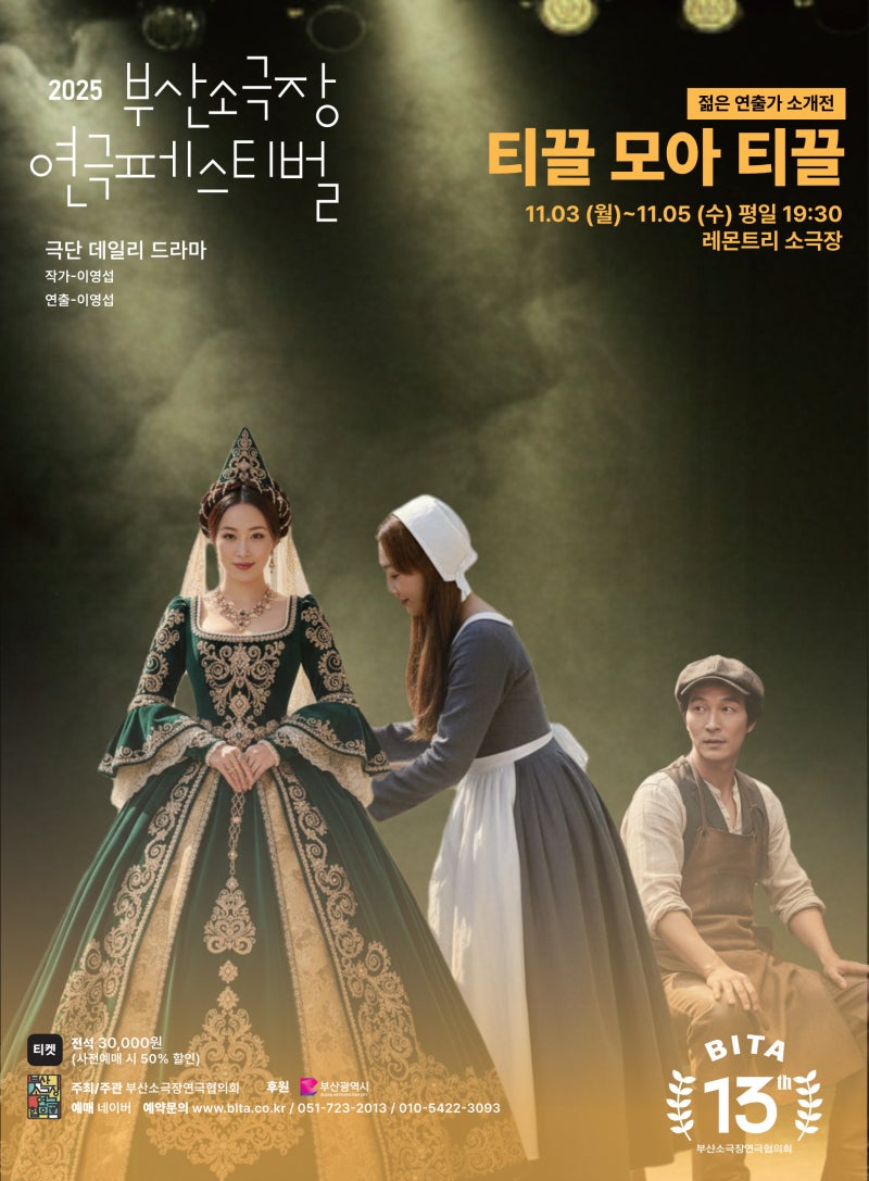 티끌 모아 티끌 ◾ 일자 : 2025.11.3 (월) ~ 2025.11.5 (수) ◾ 시간 : 평일 19:30 ◾ 장소 : 레몬트리소극장 ◾ 문의 : 051-723-2013 / 010-5422-3093 |