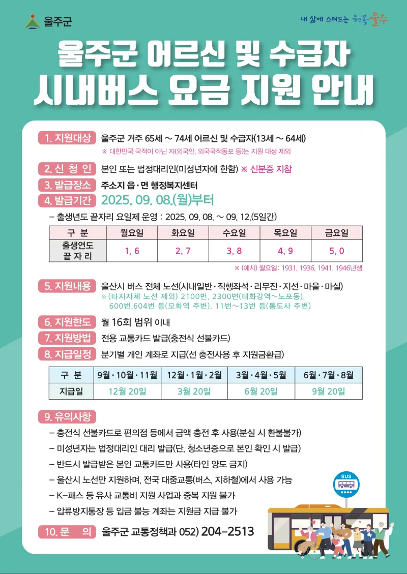울주군에서 ✨교통비 부담을 덜어드리고자✨ 울주군민 어르신·수급자 대상으로 시내버스 요금 지원을 시작합니다!