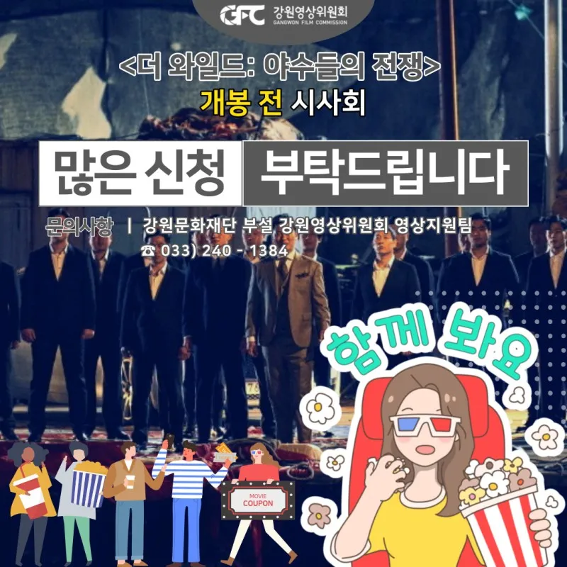 강원영상위원회 2021 로케이션 인센티브 지원작 <더 와일드: 야수들의 전쟁> 강릉 시사회 신청을 원하시면 아래의 문항에 기입 바랍니다. 수집 된 개인정보는 당첨안내 후 파기될 예정입니다. [시사회 안내] ■ 영화: 더 와일드: 야수들의 전쟁 ■ 등급: 청소년 관람불가 ■ 일시: 2023. 11. 14.(화) 19:30 ■ 장소: CGV강릉 ※본 영화는 [청소년 관람불가] 영화입니다. ※시사회 입장 전 신분증 확인 후 입장 부탁드립니다. (주민등록증, 운전면허증, 여권, PASS 모바일 신분증) ※만 18세 미만(영,유아 포함)은 ...