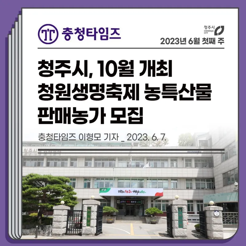 청주시는 오는 10월 열리는 `2023 청원생명축제' 농특산물 판매장에 참여할 농가를 모집한다. 판매장은 행사 기간인 10월6일부터 15일까지 오창읍 미래지 농촌테마공원에서 운영할 예정이다.