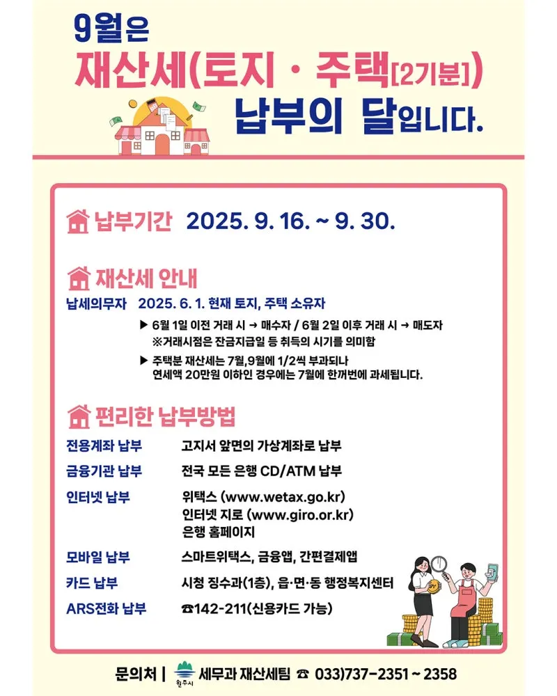9월은 재산세(토지·주택 2기분) 납부의 달입니다. 📢