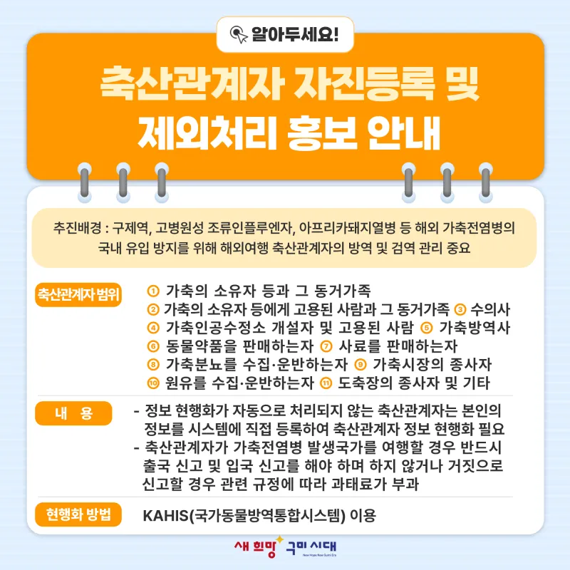 해외여행을 다녀온 축산관계자분들은 구제역, 고병원성 조류인플루엔자, 아프리카돼지열병 등 해외 가축전염병의 국내 유입 방지를 위해 운영되는 축산관계자 자진 등록 제도에 참여 부탁드립니다! ✍️