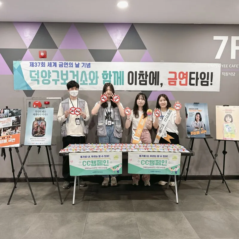 지난 5월 30일, 경기도 고양특례시 덕양구 보건소는 제37회 세계 금연의 날(5월 31일)을 맞이해 화정역 문화광장에서 금연 캠페인 활동을 펼쳤습니다. 덕양구 보건소를 비롯해 국립암센터 경기북부금연지원센터, 국가보험공단 덕양지사, 청정 금연 서포터즈 등 여러 기관들이 참여했습니다.