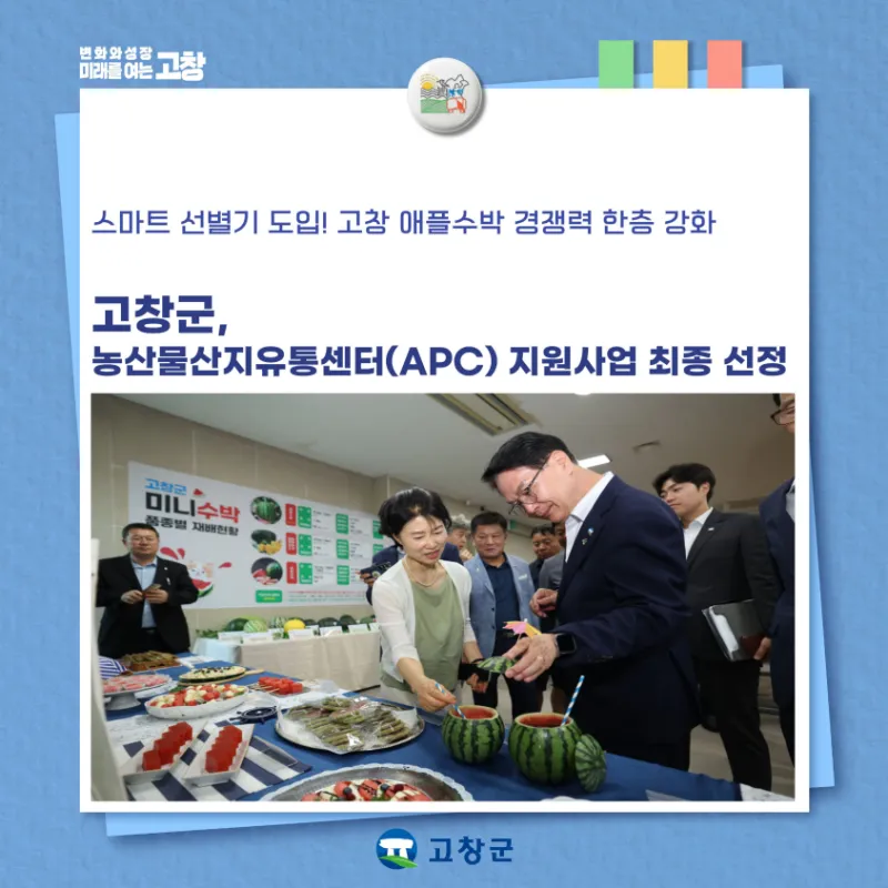 고창군이 농림축산식품부 주관 '2026년 농산물산지유통센터(APC) 지원사업' 공모에서 최종 대상자로 선정돼 지역농산물 경쟁력 강화 사업이 추진됩니다. 총사업비 10억 원을 확보해 고창군 농산물종합유통센터 애플수박 전용 스마트 선별기 구축과 유통센터 시설 개보수 사업이 진행됩니다. 애플수박을 정밀하게 선별하고 등급을 매길 수 있는 선별시설을 도입해 생산-선별-출하의 일원화 체계를 구축하고 물류 효율성과 품질관리 수준을 동시에 높일 계획입니다. 또한, 저온저장 시설과 선별장 개보수 등도 진행돼 농산물 저장 능력 향상과 작업환경 개선, 위생관리 수준 향상이 기대됩니다. 고창군은 앞으로도 지역농산물의 부가가치를 높이는 유통 현대화 사업을 지속 추진하여 지역 농업의 발전에 최선을 다할 계획입니다.
