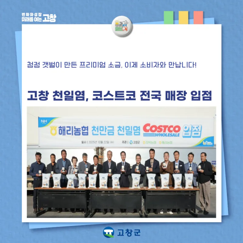 고창군 청정 갯벌에서 생산된 '고창 천만금 천일염'이 코스트코 전국 20개 매장에 공식 입점했습니다. 입점 품목은 부드럽고 깔끔한 맛이 특징인 '고창 구운소금'과 쓴맛을 줄이고 미네랄이 풍부한 '탈수 천일염' 2가지 입니다. 이번 코스트코 입점은 고창 천일염의 품질과 전통이 공식적으로 인정받은 결과로, 고창군은 앞으로도 '청정 갯벌, 건강한 먹거리'라는 가치를 중심으로 지역 특산품의 브랜드화와 유통 다변화를 적극 지원할 계획입니다.