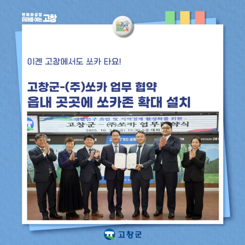 고창군과 (주)쏘카가 공유 차량 기반으로 지역경제 활성화와 생활 인구 유입 확대에 나섭니다. 지난 24일 고창군과 (주)쏘카가 '쏘카존 도입을 위한 업무 협약'을 체결했습니다. 이번 협약은 지난 8월 29일 열린 행정안전부-인구감소 지역-한국철도공사-쏘카 간 업무 협약의 후속 조치로 마련됐습니다. 고창군은 쏘카와 실무 협의를 거쳐 기존 고창 터미널 인근 1곳에서 운영 중이던 쏘카존을 고창군 내 공영주차장 6곳으로 확대 운영하기로 결정했습니다. 이에 따라 총 7곳으로 운영되며, 지역 내 교통 편의성이 크게 향상될 전망입니다. 또한, 고창군을 찾는 관광객들에게 교통 편의를 제공함으로써 관광 활성화 효과도 기대됩니다. '고창에서도 이제 쏘카타고 편하게 다니세요!🚗'