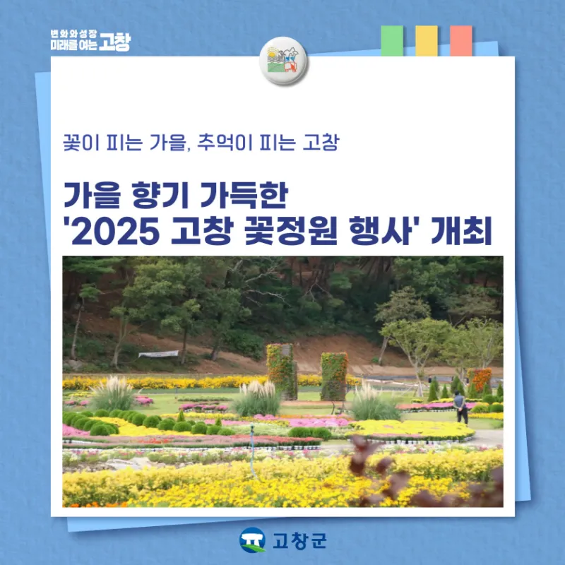 오는 31일부터 11월 2일까지 3일간 고창 꽃정원에서 '2025 고창 꽃정원 행사'를 개최합니다. 군민과 관광객을 대상으로 국화, 백일홍, 코스모스 등 가을꽃과 함께하는 체험프로그램을 제공함으로써 지역문화 인지도를 높이고 지역경제 활성화를 위해 마련됐습니다. 행사 기간 방문객들은 인생네컷, 핸드케어 체험, 돌려라! 플라워 가챠 등 다양한 프로그램을 즐길 수 있습니다. 또한, 행사장 곳곳에는 꽃밭 포토존과 플라워 양산 대여 서비스가 함께 진행됩니다. 고창 꽃정원에서 가을의 정취를 만끽하며 소중한 추억을 쌓아보세요!🌼🌼