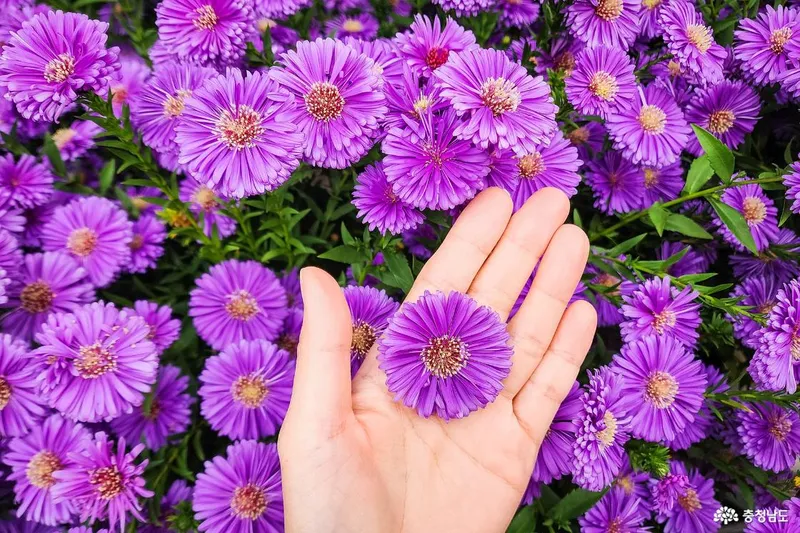 예쁜 아스타국화를 손바닥 위에 올렸어요.