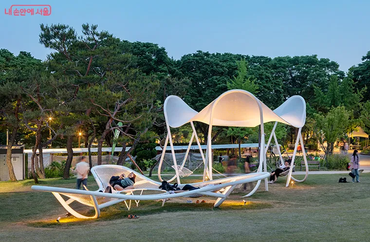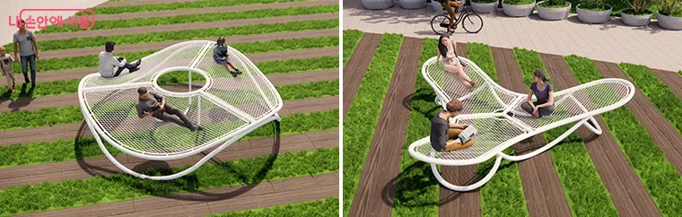 이번에 첫선을 보이는 휴게공간 ‘한들한들’은 그물망에 누워 자연과 함께 가볍게 흔들리며 휴식하는 이미지를 형상화한 휴게시설물이다. 대형, 중형, 소형 3가지 모델로 구현됐으며, 각각 연잎, 연꽃, 꽃봉오리를 의미한다.
