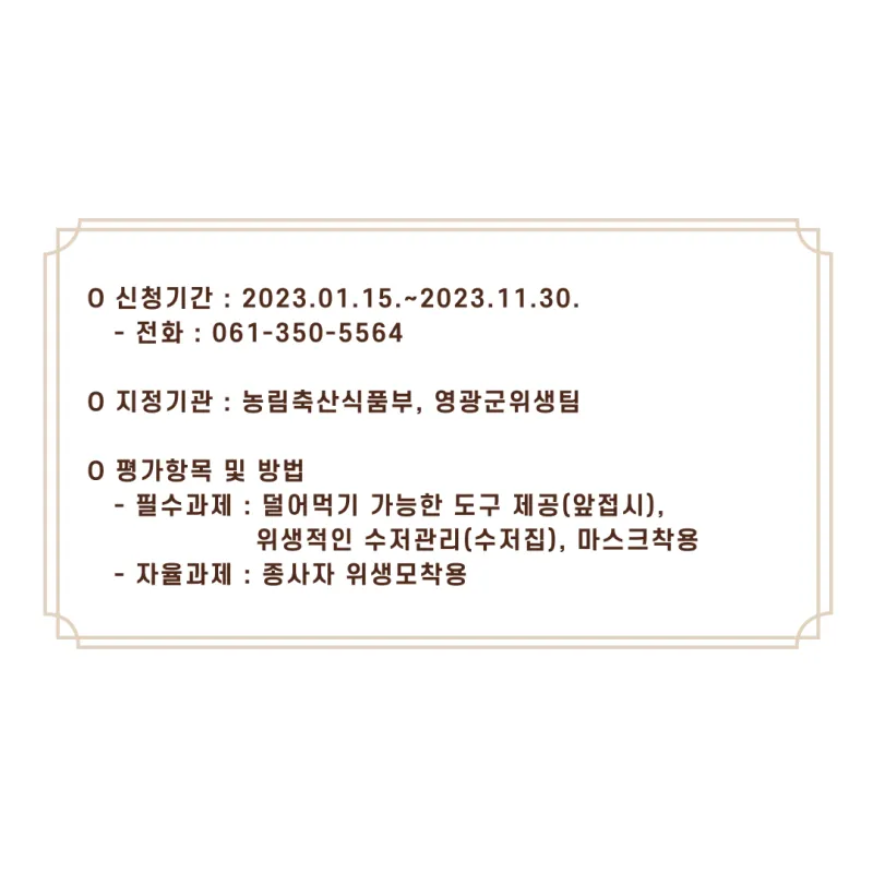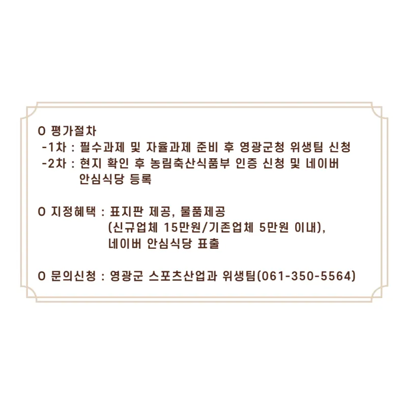 1차 : 필수과제 및 자율과제 준비 후 영광군청 위생팀 신청 2차 : 현지 확인 후 농림축산식품부 인증 신청 및 네이버 안심식당 등록 |