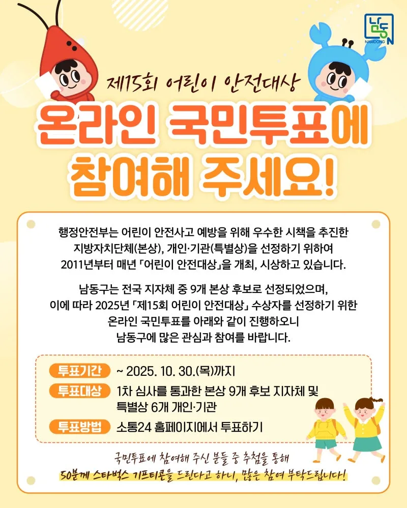 행정안전부는 어린이 안전사고 예방을 위해 우수한 시책을 추진한 지방자치단체(본상), 개인·기관(특별상)을 선정하기 위하여 2011년부터 매년「어린이 안전대상」을 개최, 시상하고 있습니다. 2025년 「제15회 어린이 안전대상」 수상자를 선정하기 위하여 온라인 국민투표를 아래와 같이 진행하오니 많은 관심과 참여를 바랍니다. ○ 투표기간 : 2025. 10. 23.(목) ~ 10. 31.(금) ○ 투표대상 : 1차 심사를 통과한 본상 9개 후보 지자체 및 특별상 6개 개인·기관 ○ 투표방법 : 각 후보의 응모서...