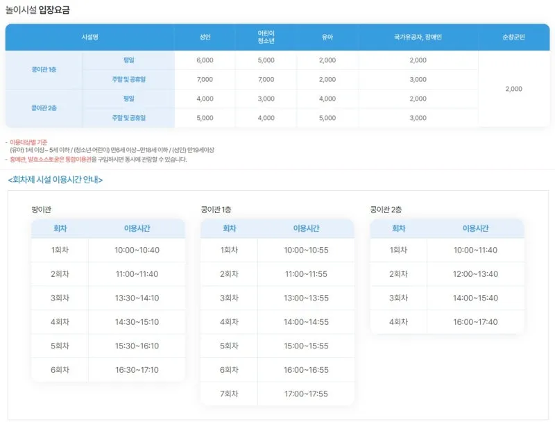 ■순창발효테마파크 놀이시설 입장요금 및 회차별 이용시간 안내