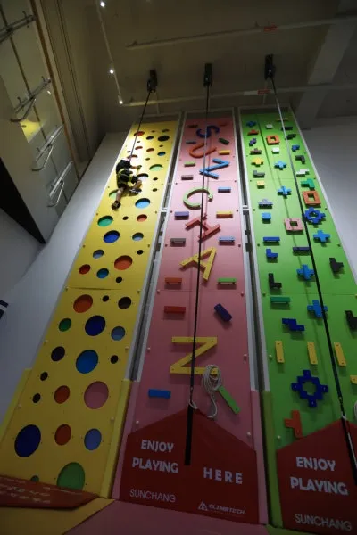 챔피언 스포츠 파크 스릴 만점 스팟 답게 아이들 순간 집중력과 평소에 안 쓰는 근육 사용으로 재미가 두 배인 클라이밍 & 퀵 점프!! 가 대세인데요, 아이들 시점 난이도 별로 노랑, 분홍, 연두색 클라이밍 존은 안전요원 두 분과 안전장치와 안전 장비(안전모& 안전벨트) 시범 화면으로 더 든든했습니다.