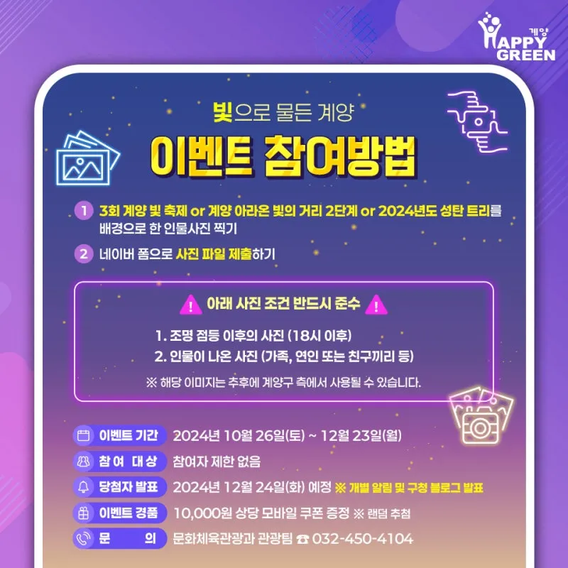 ❗ 아래 사진 조건 반드시 준수 ❗ 1️⃣ 조명 점등 이후의 사진 (18시 이후) 2️⃣ 인물이 나온 사진 (가족, 연인 또는 친구끼리 등) ※ 해당 이미지는 추후에 계양구 측에서 사용될 수 있습니다. |