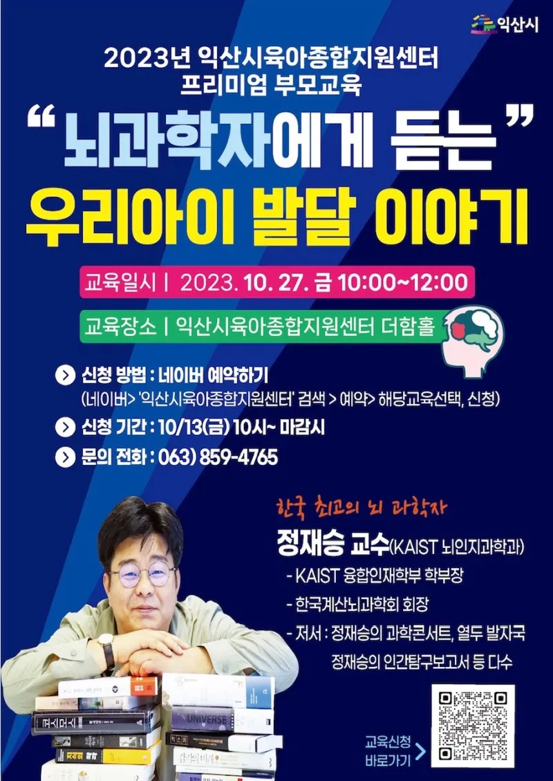 익산시는 우리나라 뇌과학계의 최고 권위자인 카이스트 뇌인지과학과 정재승 교수를 초청해 오는 27일에 익산시육아종합지원센터에서 프리미엄 부모교육을 진행한다.