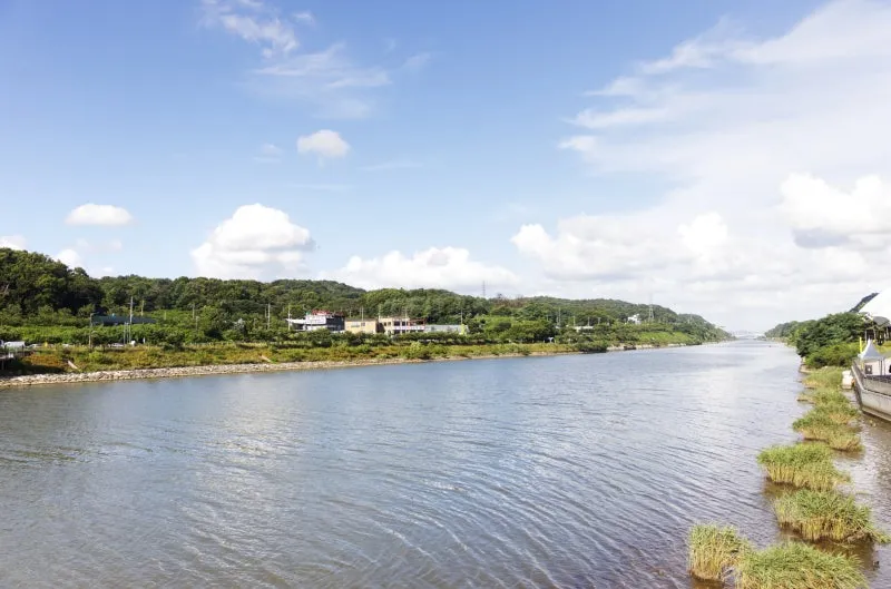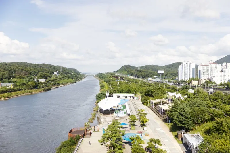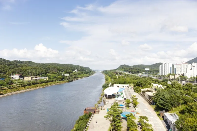 오후 늦게 방문하셨다면 해가 서쪽으로 지는 이유 때문에 이렇게 아라뱃길의 동쪽을 바라보고 찍으면 쨍한 사진을 남기실 수 있습니다. 🏞️