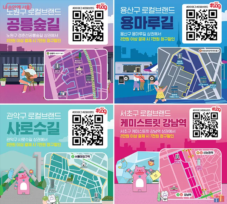 이번 이벤트는 서울시 내 8개 로컬브랜드 상권(▴노원 경춘선공릉숲길 ▴용산 용마루길 ▴관악 샤로수길 ▴서초 케미스트릿 강남역 ▴강북 사일구로 ▴동대문 회기랑길 ▴성북 성북동길 ▴중랑 상봉먹자골목)에서 진행된다.