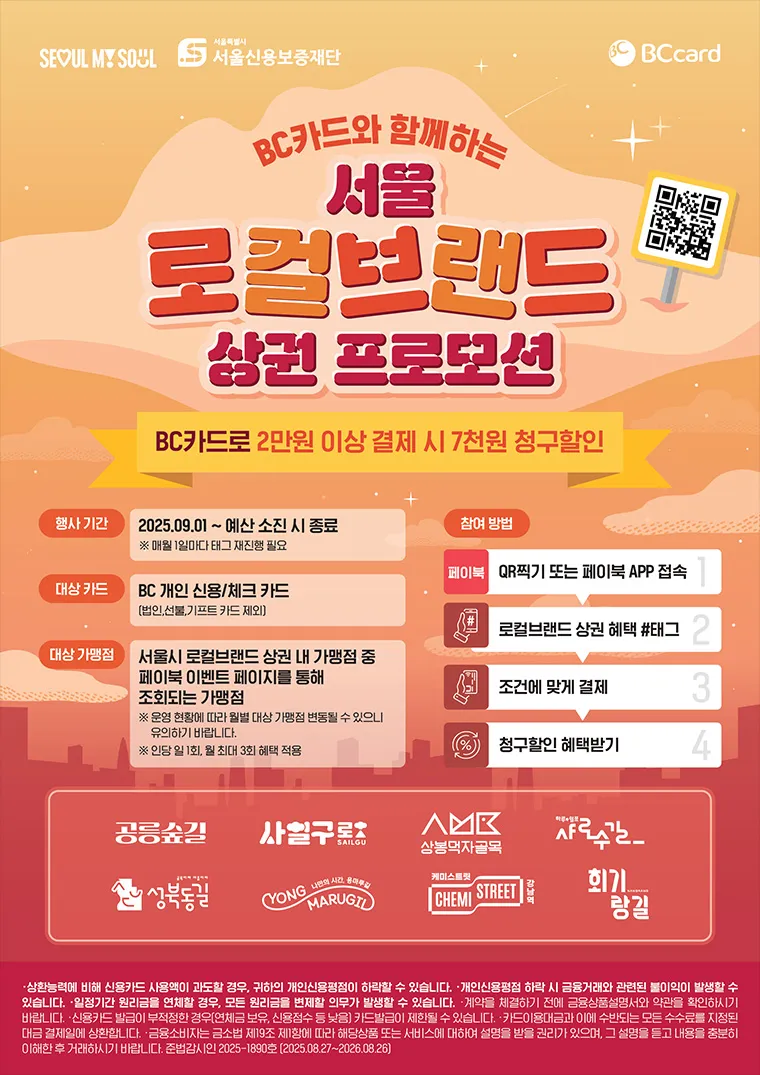 서울 로컬브랜드 상권 프로모션 ㅇ행사기간 : 2025.9.1.~예산 소진 시 종료 ㅇ대상카드 : BC개인신용/체크카드 로컬브랜드 상권 ▴노원 경춘선공릉숲길 : 노원구 동일로 186길 일대 ▴용산 용마루길 : 용산구 새창로 14길 일대 ▴관악 샤로수길 : 관악구 관악로14길 일대 ▴서초 케미스트릿 강남역 : 서초구 서초대로 75길 77길 일대 ▴강북 사일구로 : 강북구 4.19로 일대 ▴동대문 회기랑길 : 동대문구 경희대로 일대 ▴성북 성북동길 : 성북구 성북로 일대 ▴중랑 상봉먹자골목 : 중랑구 봉우재로 33길 일 |