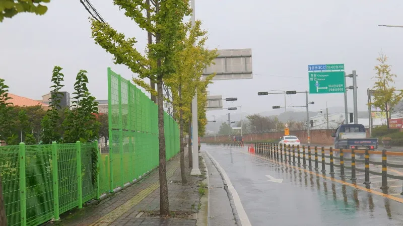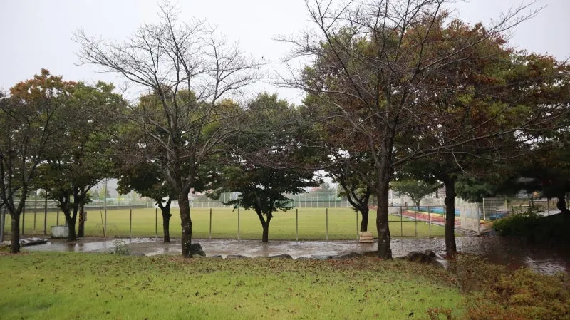 산책길 사이로 군북운동장 울타리가 보이고 그 너머로 가을철 물들어 가는 잔디가 가을비에 젖은 풍경이 시야에 들어옵니다.