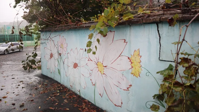 축구장을 지나는 산책길 아래로 중암리 주택가 담장에 가을꽃 코스모스 벽화와 낙엽이 물들어가는 담쟁이가 잘 어울립니다.
