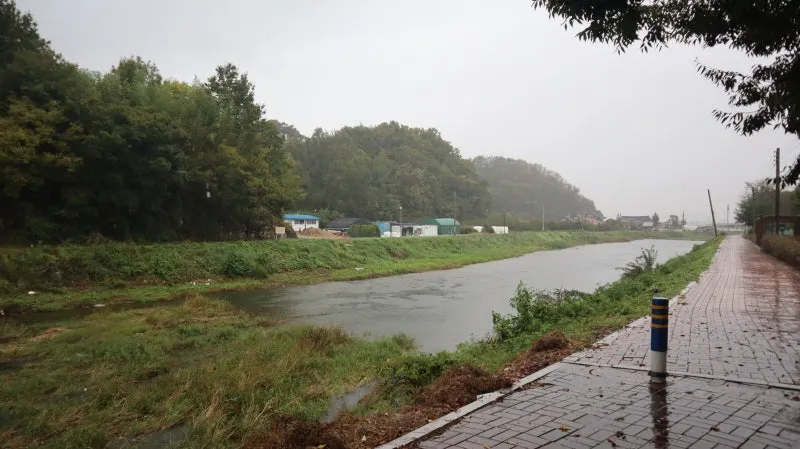 뒤쪽으로 돌아서니 세찬 빗물에 힘차게 흘러가는 함안의 군북천이 보이며, 산책이나 조깅을 할 수 있는 길도 보입니다.