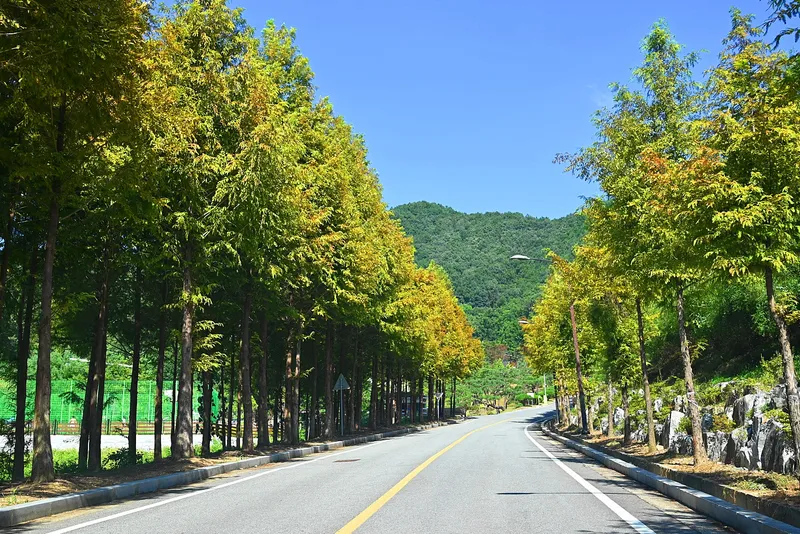 양촌자연휴양림으로 들어가는 길가의 나무가 천천히 가을빛을 담고 있습니다.