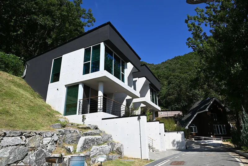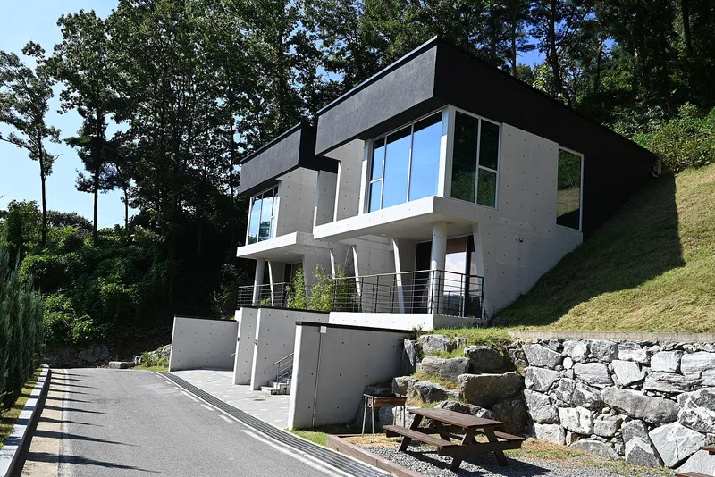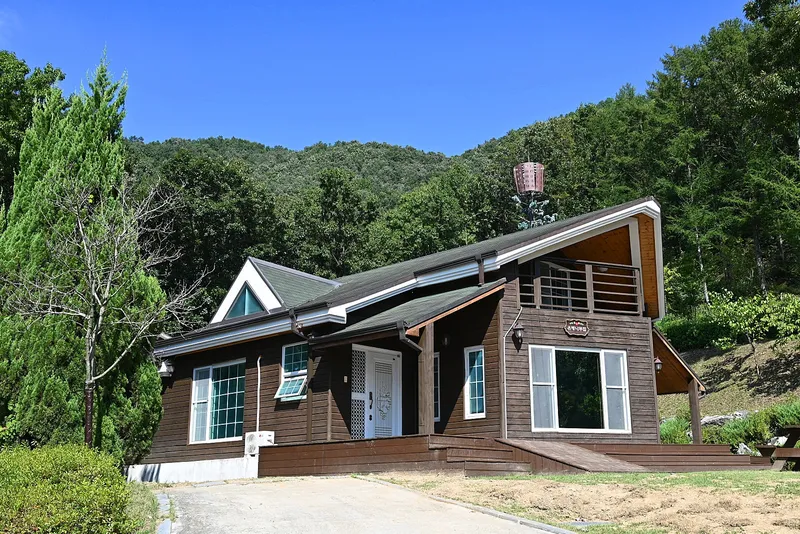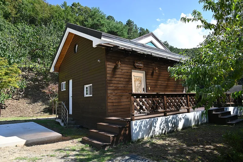글램핑장 뒤에 숙박시설이 있습니다. 전나무 집, 잣나무집 그리고 소나무집이 있습니다.