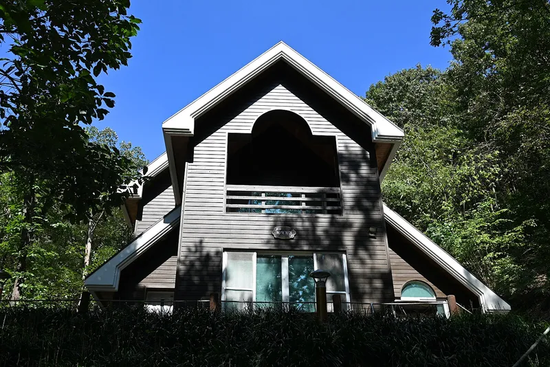 오르면 뾰족집이 보이는데 숲속의 집 두 채가 있습니다.
