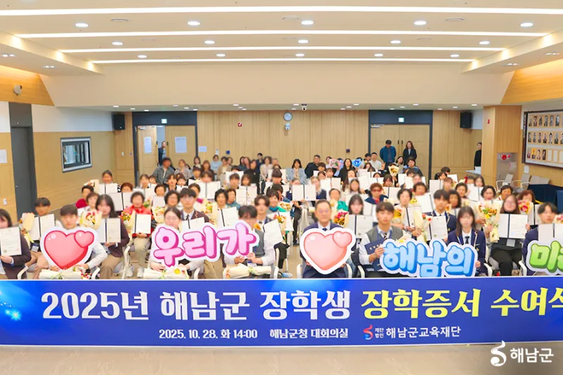 해남군청 대회의실에서 ‘2025년 해남군 장학생 장학증서 수여식’을 열었는데요.