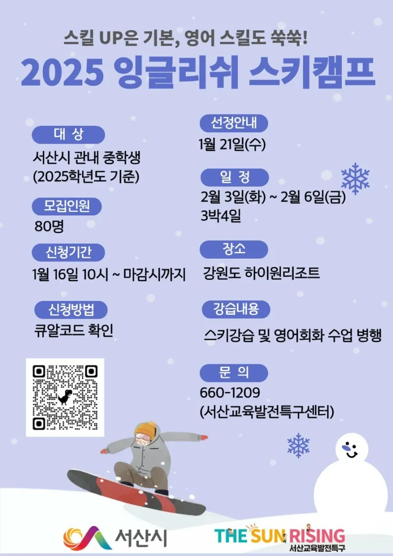 서산시 교육발전특구센터에서 ‘2025 잉글리쉬 스키캠프’ 참가 학생을 모집합니다.
