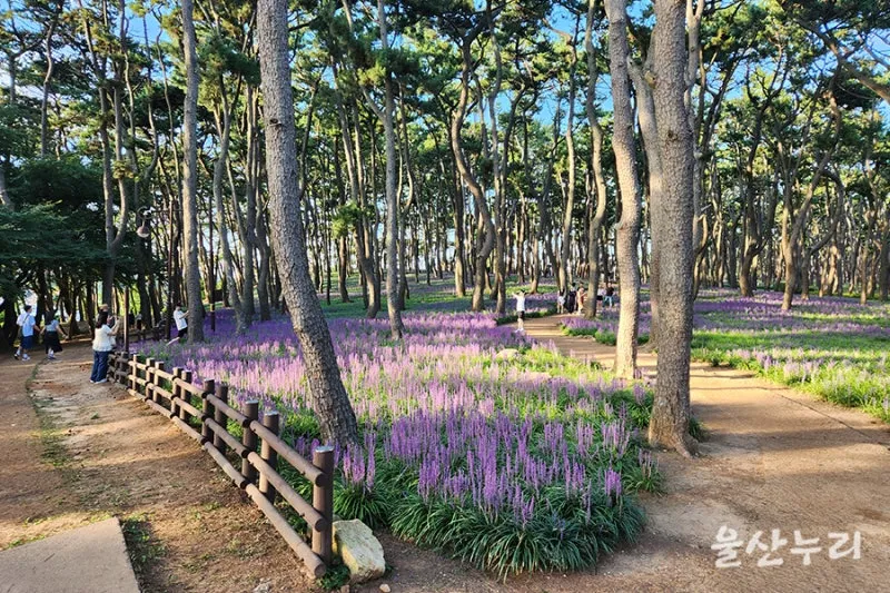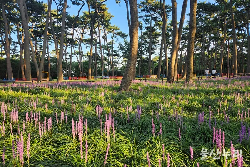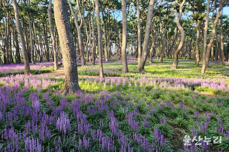 울산 가볼 만한 곳으로 울산 동구 대왕암공원에서 보랏빛으로 끝없이 펼쳐진 맥문동 꽃밭을 구경하며 산책해 보세요.