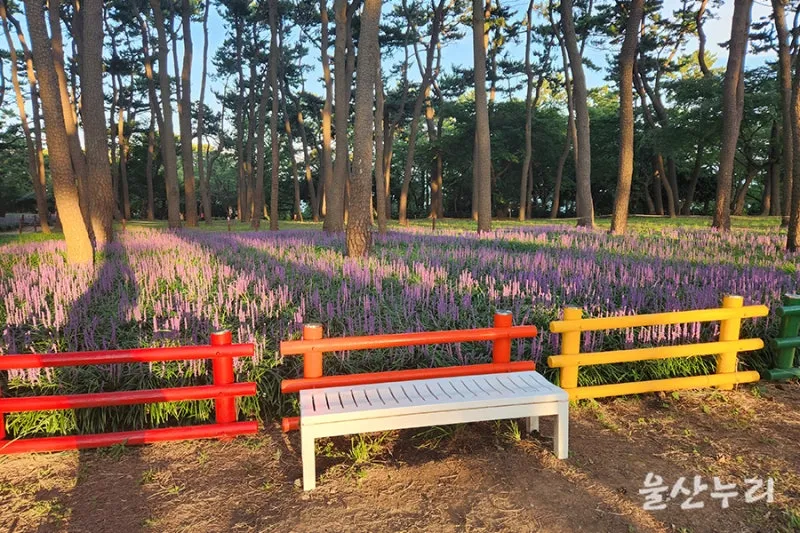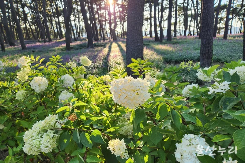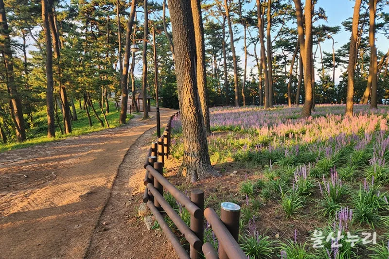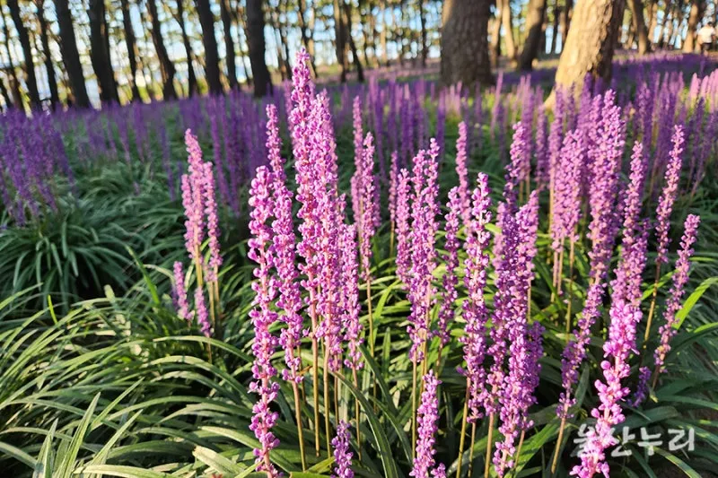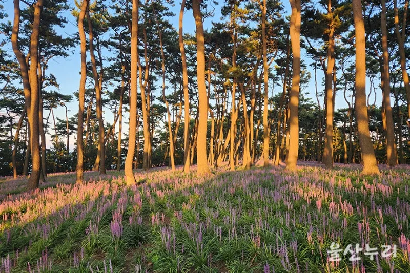 해가 떨어지는 늦어 오후에 대왕암공원 곰솔 소나무 숲에 보랏빛 맥문동 꽃밭이 아름답네요.