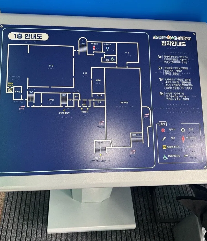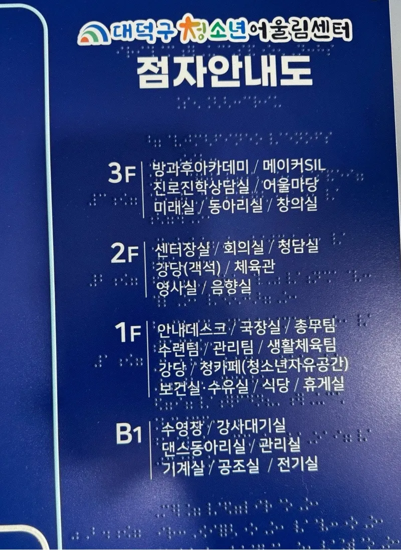 입구 앞에는 대덕구 청소년 어울림센터 안내도가 있으니 확인하시고 이용하시면 됩니다. 대전 대덕구 청소년 어울림센터는 층별로 여러 다양한 프로그램들을 운영하는 주요 시설들이 있으니, 안내도를 보시고 이용하시면 됩니다.