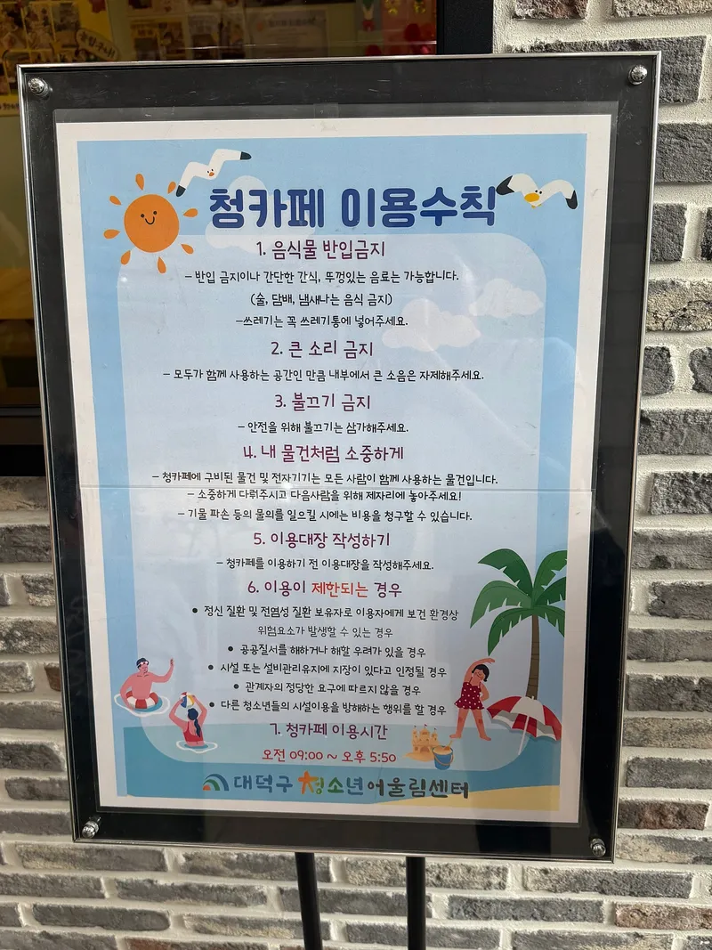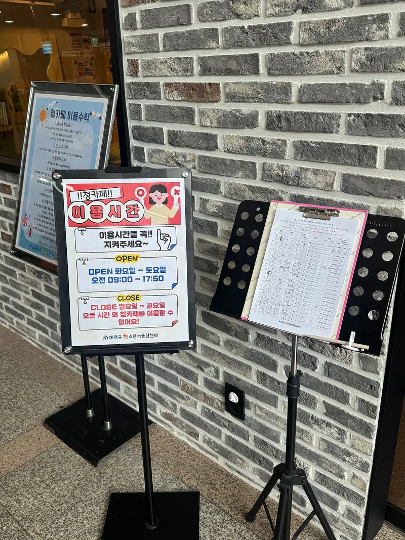 그리고 1층에 들어가자마자 청카페라는 공간이 바로 눈에 띄었습니다. 이곳은 청소년들이 자유롭게 이용할 수 있는 청카페입니다. 청카페 이용시간은 오전 9시부터 오후 5시 50분까지 이용가능하며, 청카페는 이용수칙이 있습니다.