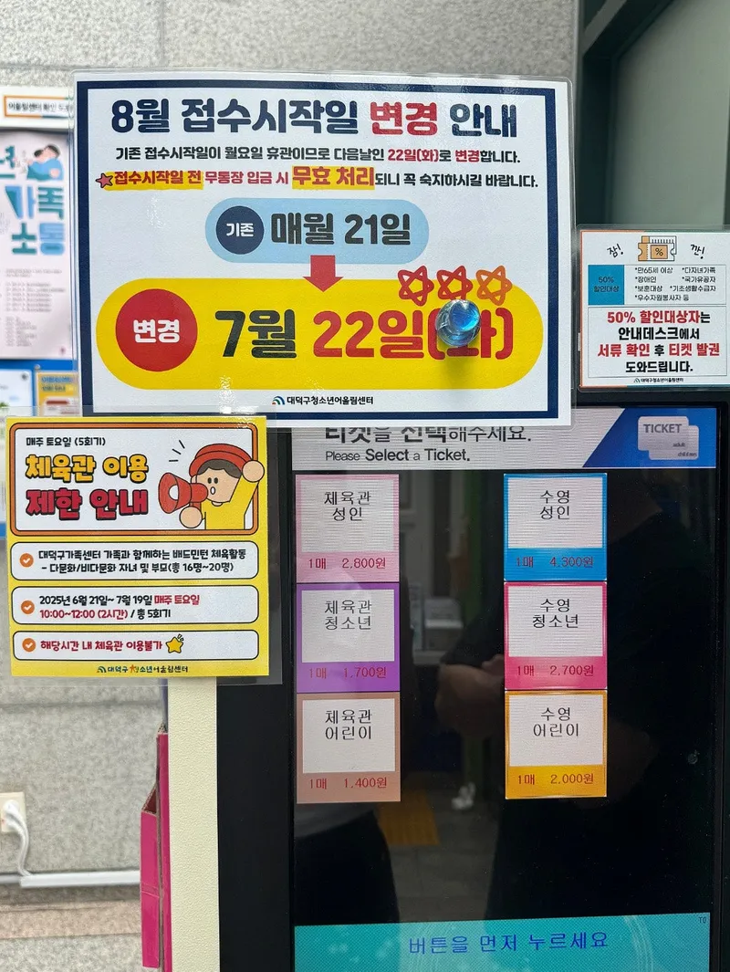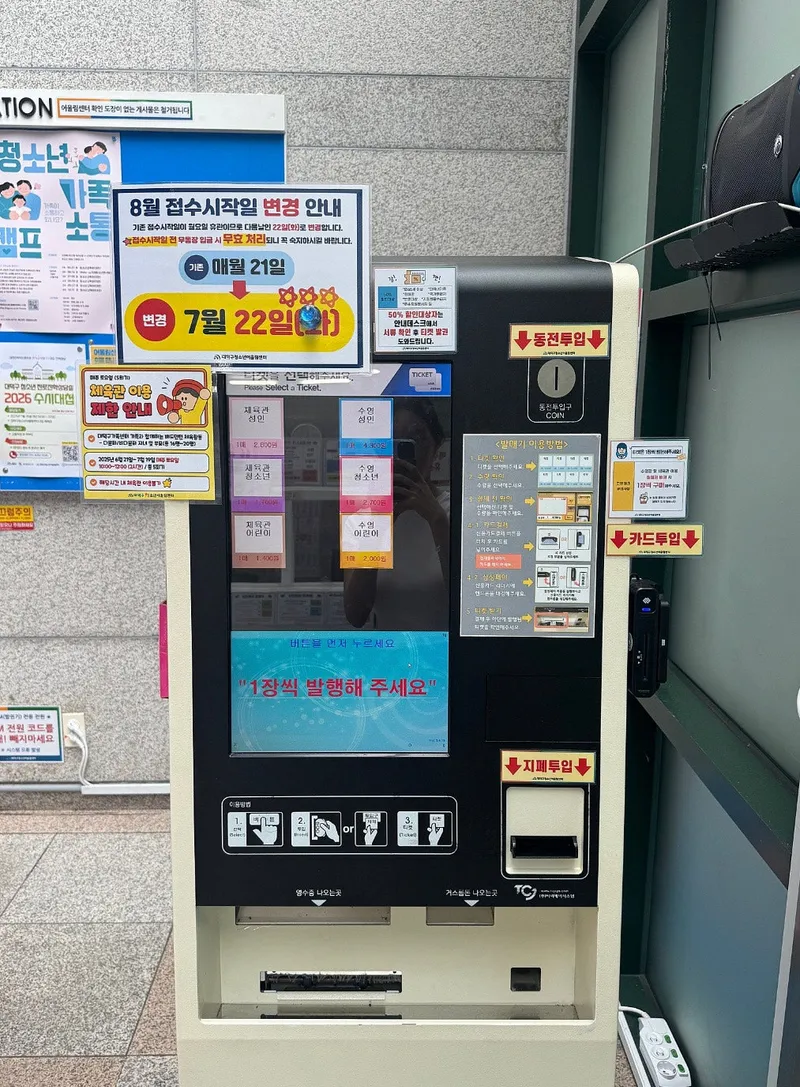 체육관 시설 이용과 수영 시설 이용은 입구 바로 앞에서 티켓을 구매 후 이용하실 수 있습니다. 특히 요즘 같은 더운 한여름에는 체육관 시설이나 수영장을 부담스럽지 않은 가격으로 이용할 수 있다는 점이 너무 좋은 점인 것 같습니다.