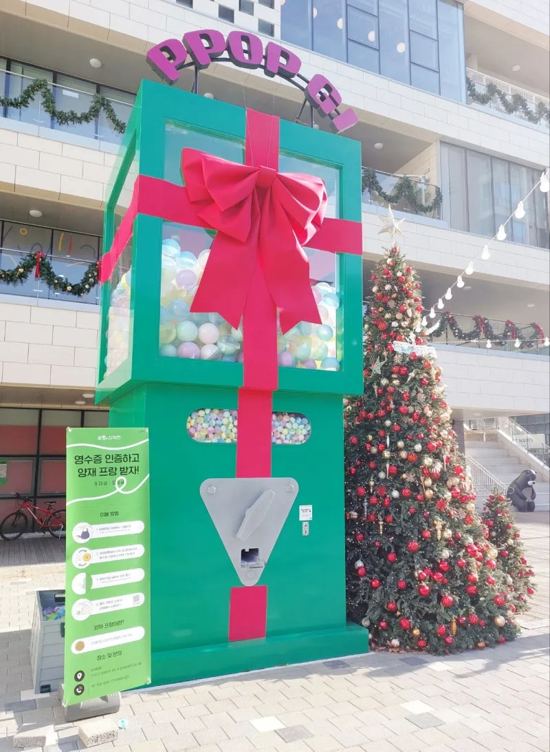 양재 프랑으로 받을 경우, 양재공영주차장 입구의 '그린몬스터'에서 뽑기를 해서 양재천길 상권에서 사용할 수 있는 쿠폰을 수령하면 되는데요.
