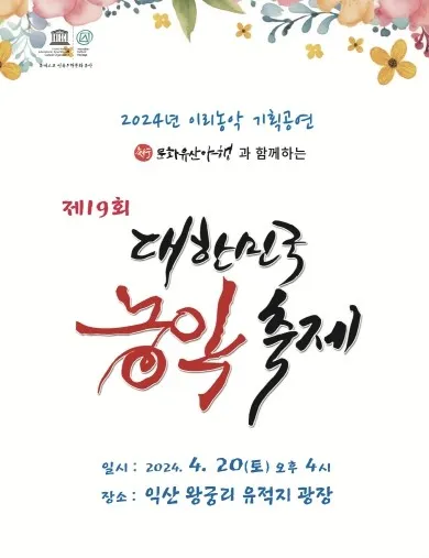 익산시는 '제19회 대한민국 농악축제'가 오는 20일 오후 4시에 백제왕궁인 익산왕궁리유적에서 개최된다고 밝혔다.