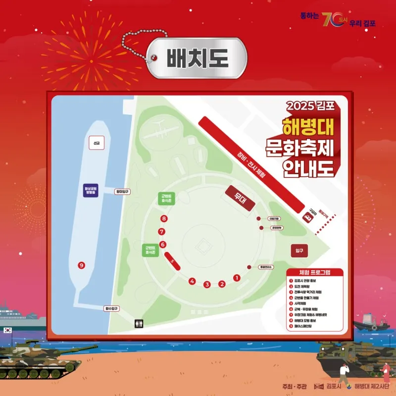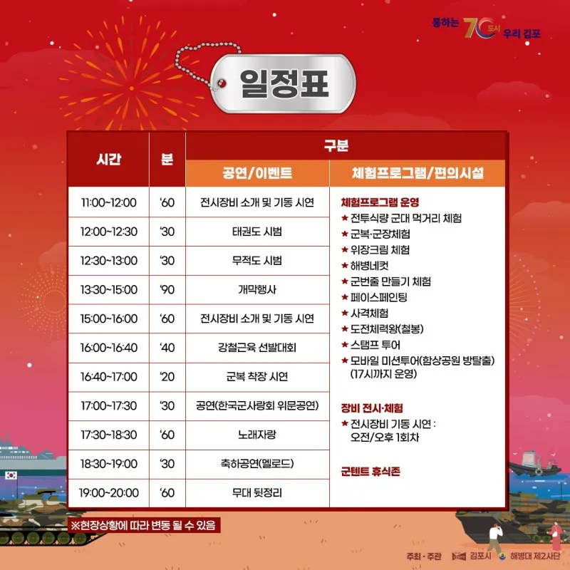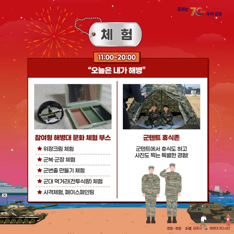 체험 프로그램 운영 - 전투식량 군대 먹거리 체험 - 군복·군장체험 - 위장크림 체험 - 해병네컷 - 군번줄 만들기 체험 - 페이스페인팅 - 사격체험 - 도전체력왕(철봉) - 스탬프 투어 - 모바일 미션투어(함상공원 방탈출) (17시까지 운영) 장비 전시·체험 - 전시장비 기동 시연 : 오전/오후 1회차 군텐트 휴식존 |