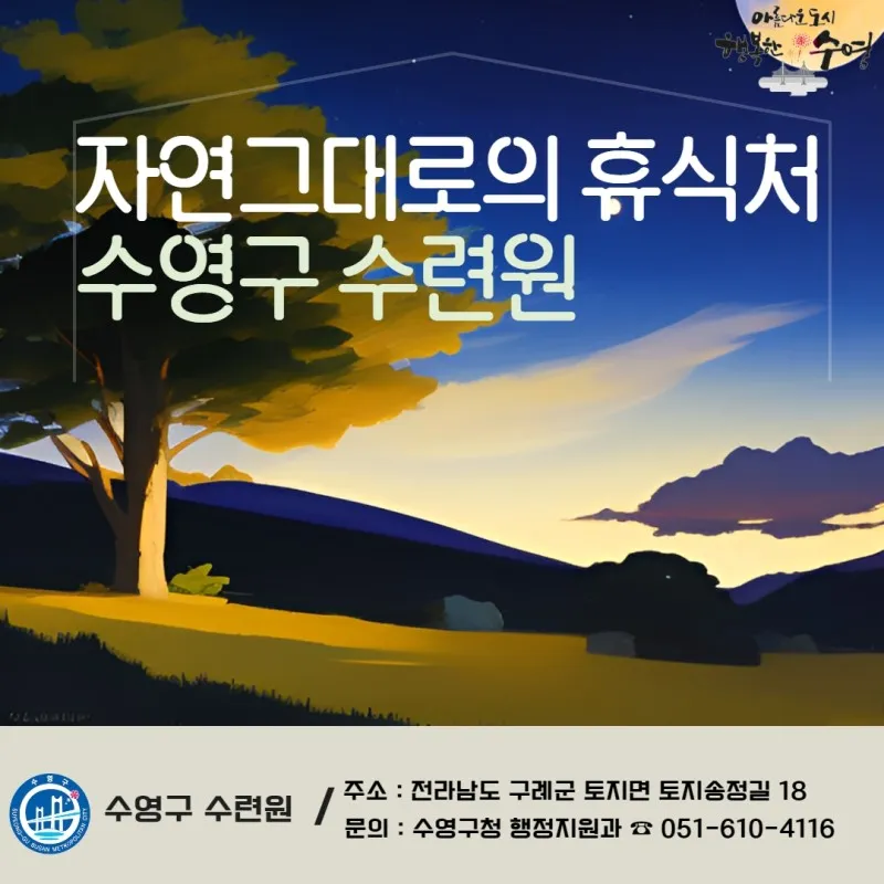 수영구 수련원은 전라남도 구례군에 위치해 있습니다. "수영구" 수련원인데 왜 전라남도 구례군에 위치해 있냐고요? 전라남도 구례군은 저희 수영구의 자매결연도시이고, 자연과의 조회를 느낄 수 있는 지역이죠! 저희 수영구에서는 이 전라남도 구례군에 저렴한 가격으로 좋은 시간을 보낼 수 있도록 수영구 수련원을 운영하고 있습니다. 수련원은 수영구민뿐 아니라 수영구 자매결연도시 주민 등 전국의 모든 분들이 이용 가능한 시설입니다. 이제 본격적으로 수영구 수련원 안내를 시작해 보겠습니다!!