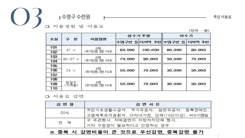 다음으로는 "가격"입니다!! 수영구 수련원의 가격 규정에서 가장 먼저 알고 계셔야 하는 점은! 수영구민, 자매결연지 주민 등과 타 지역 주민들의 가격 체계가 다르다는 점입니다!!