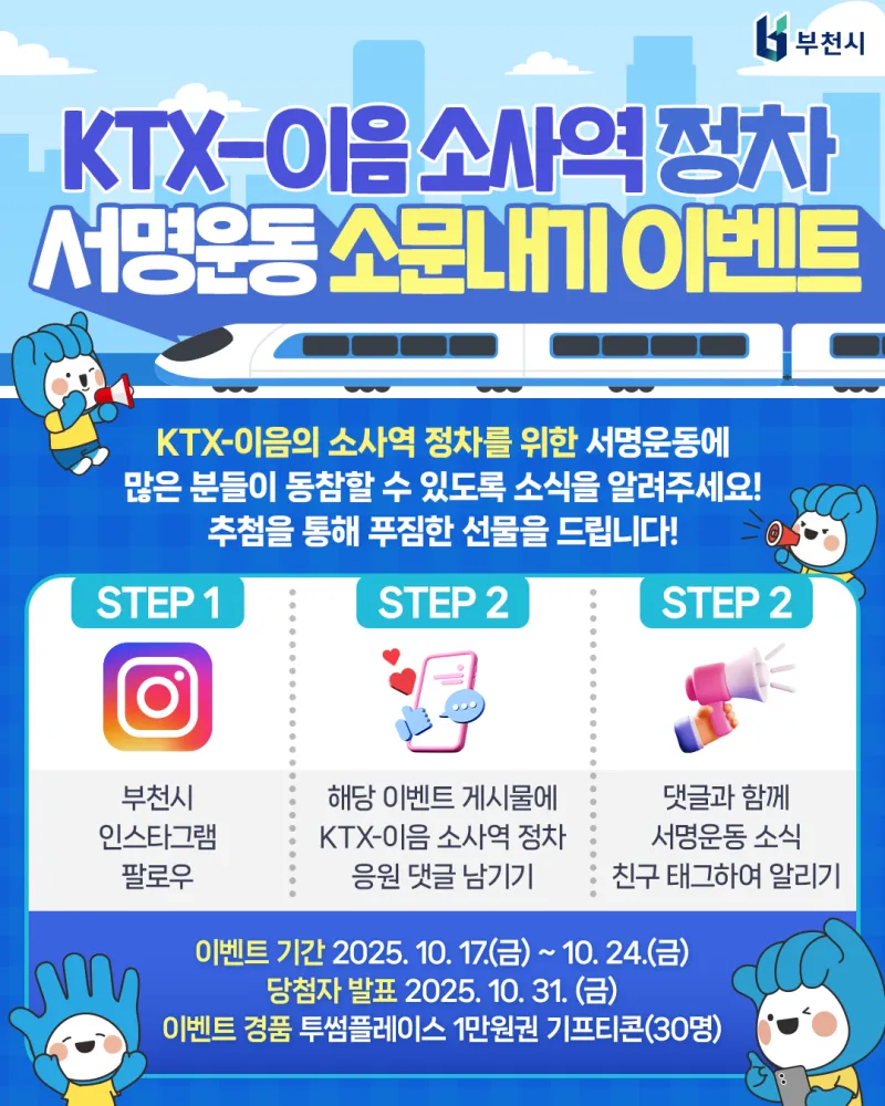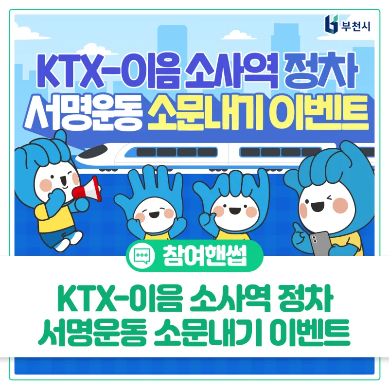 KTX-이음 소사역 정차! 부천시 서명운동 소문내기 이벤트 참여하고 선물 받자!