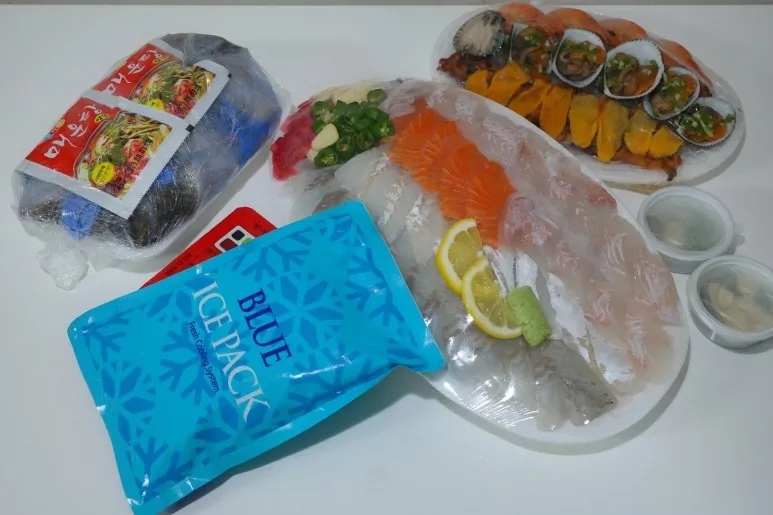제가 직접 포장으로 해서 집으로 사 온 모듬회 + 해산물 모둠입니다. 일단 회는 신선도가 중요하기에 포장상태부터 좀 걱정했는데 아이스팩을 야무지게 넣어지고 내용물이 흐트러지지 않게 꼼꼼히 해 주셨네요.