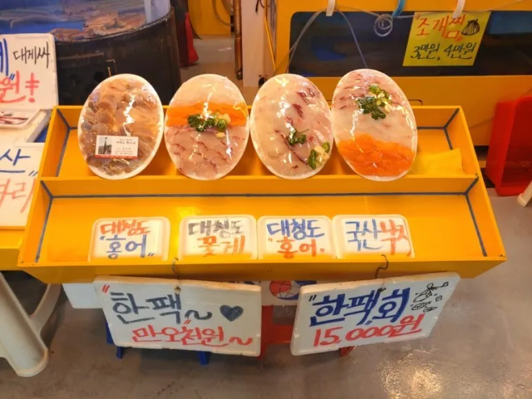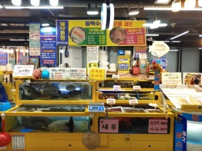 상인들끼리도 서로 협업하면서 판매를 하고 있는 것 같았습니다. 과한 호객행위도 없어 횟감, 해산물을 구경 할 때 부담이 전혀 없었답니다. 시즌에 맞는 제철 회(봄에는 도다리, 여름에는 농어 등), 연평도 꽃게 등 친절하게 소개, 추천해 주셨습니다.
