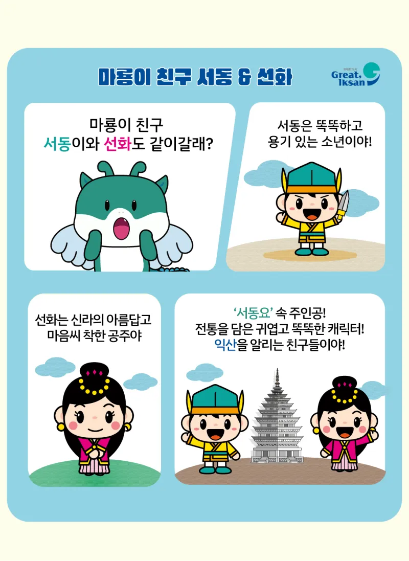이 친구들은 익산을 대표하는 설화 ‘서동요’에서 탄생한 캐릭터야!