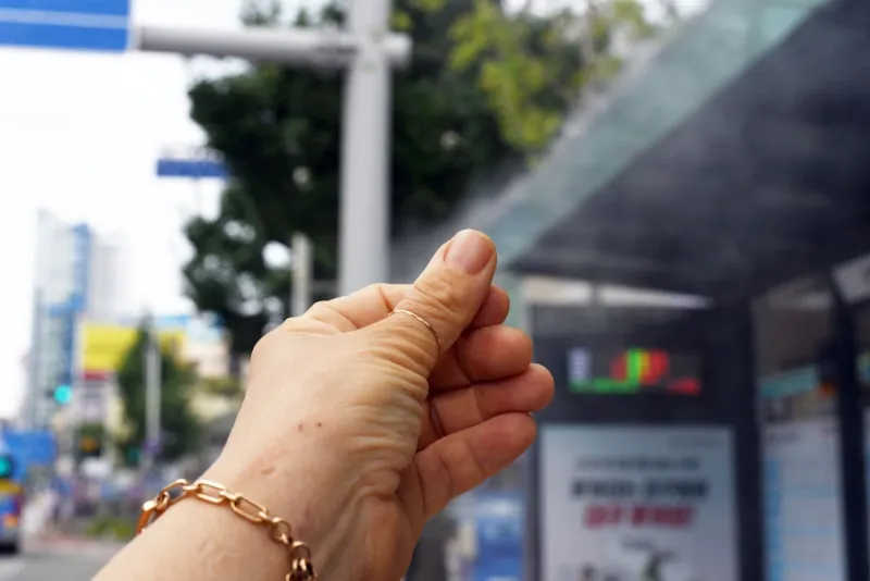 땀이 비 오듯 쏟아지고, 버스를 기다리는