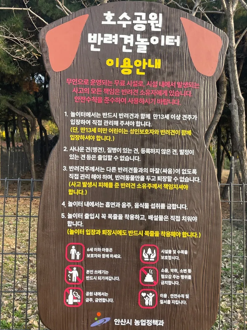 놀이터 출입 시 목줄과 배설물은 직접 치워야 합니다.