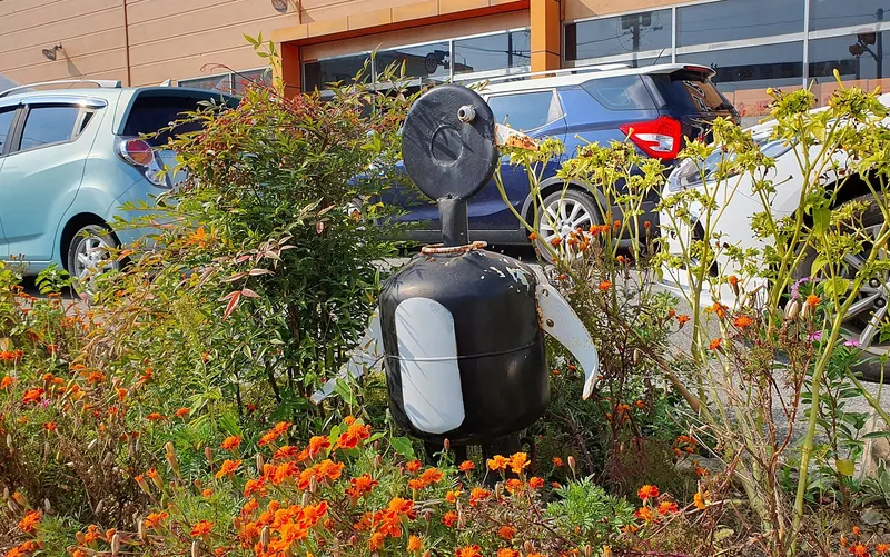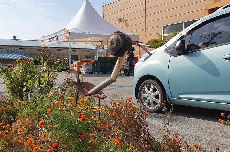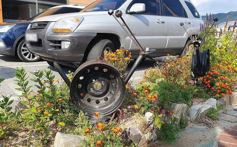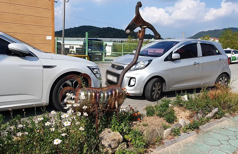 연산초등학교 앞에서 길을 건너면 한국대추영농조합 앞의 화단에도 재활용 금속 작품이 있습니다.