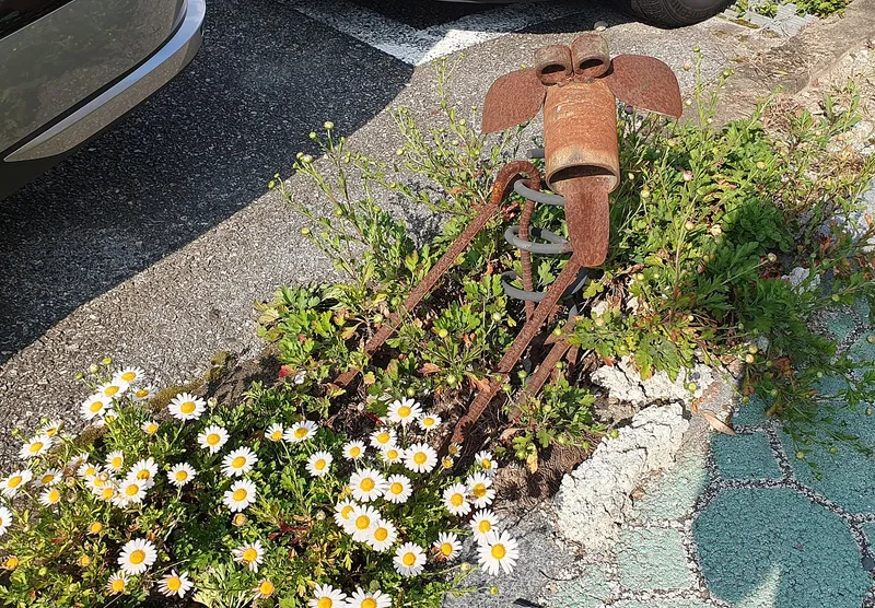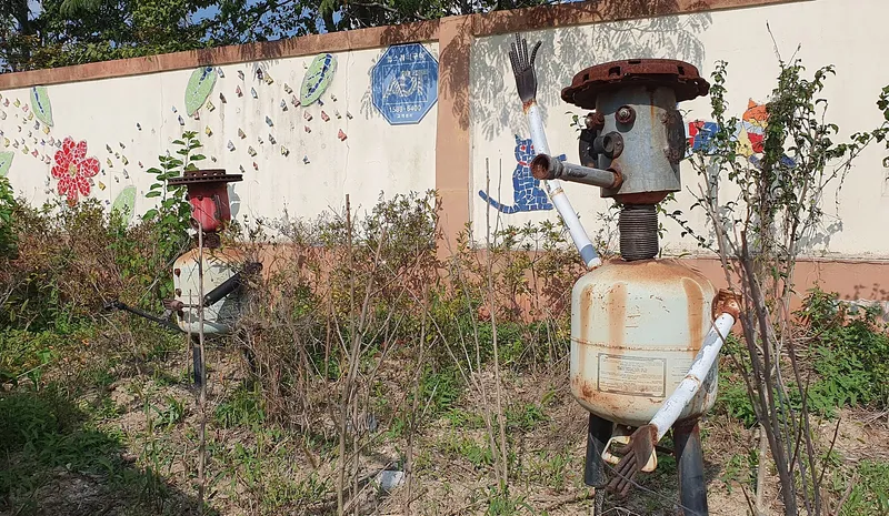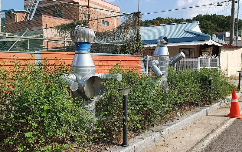 당시에 만든 재미있는 모양의 금속 재활용 작품이 길을 따라 서 있습니다.