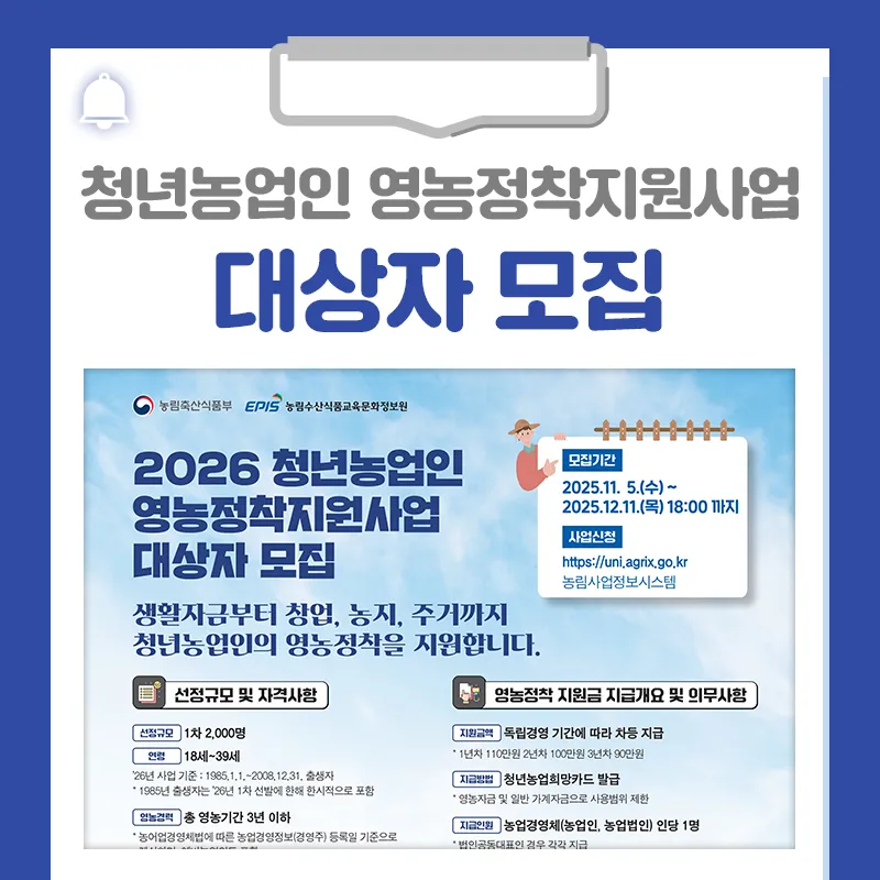 2026 청년농업인 영농정착지원사업 대상자를 모집합니다!