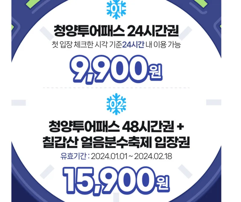 오늘부터 '청양투어패스 & 칠갑산얼음분수축제 패키지' 판매가 시작되었습니다~!!